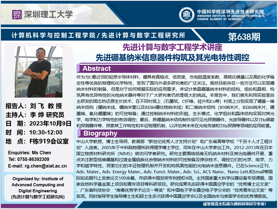 大家好!计算机学院/先进计算与数字工程研究所学术讲座第638期将于10月9日10:30-12:00在F栋919会议室举行,本次讲座将邀请中山大学 刘飞 教授作题为“先进硼基纳米信息器件构筑及其光电特性调控”的报告。本次报告将由数字所 李烨 研究员主持,诚挚邀请大家参加、学习和交流!