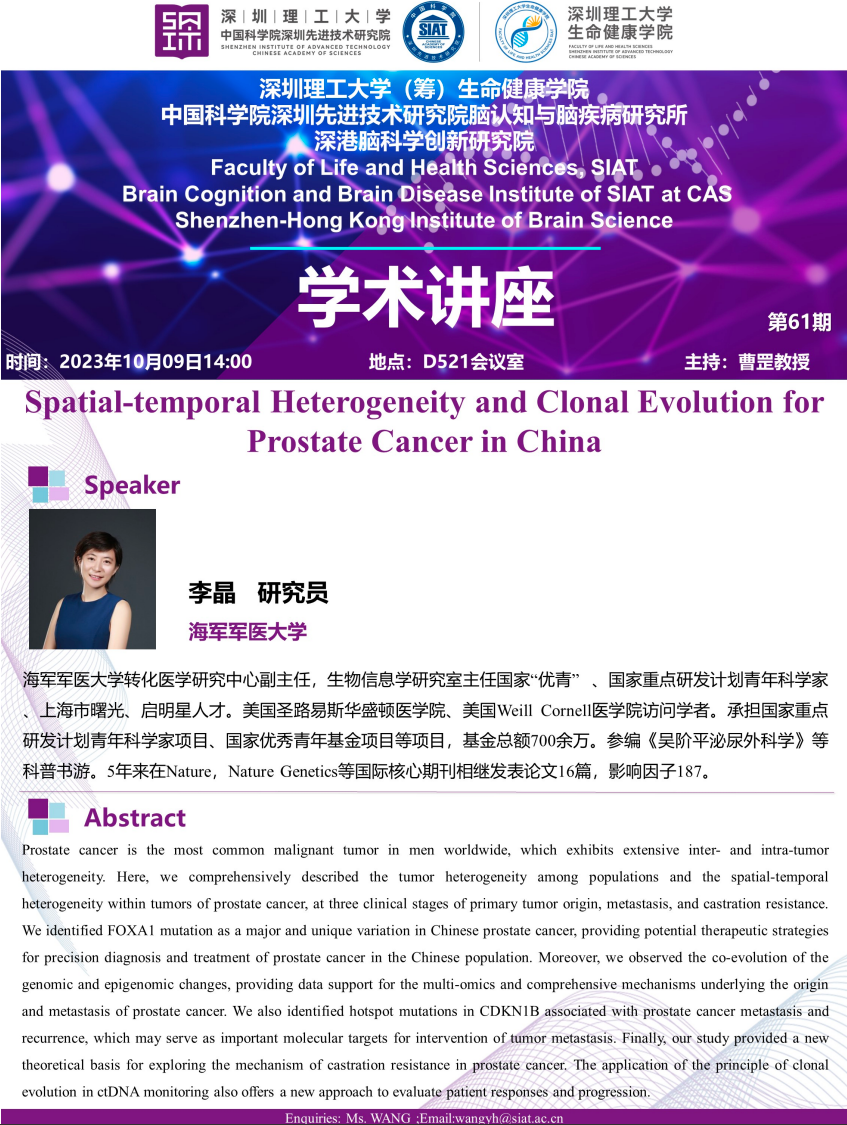 【2023年10月9日 生命健康学院/脑所】Spatial-temporal Heterogeneity and Clonal Evolution for Prostate Cancer in China