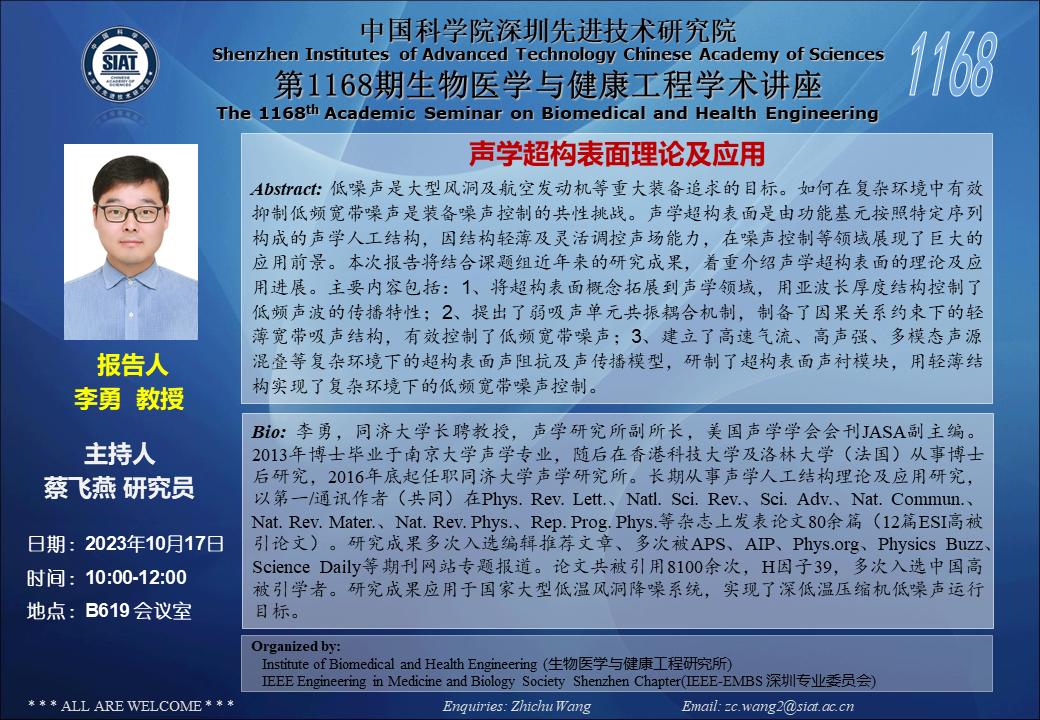 医工所第1168期学术讲座将于 2023年10月17日(周二) 10:00-12:00 在B619会议室举行。