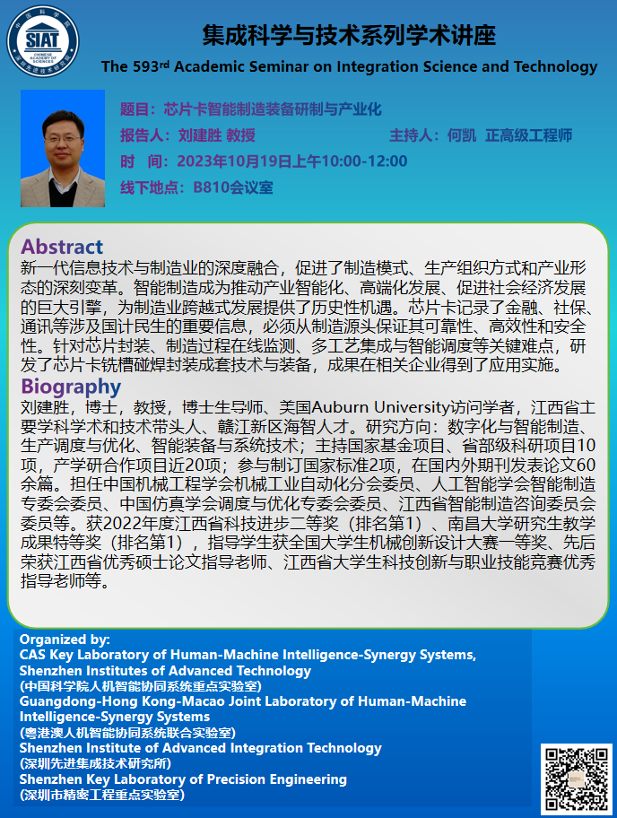 集成所第593期集成科学与技术系列学术讲座将于2023年10月19日上午10:00-12:00于B栋810会议室召开,本次讲座特邀南昌大学的刘建胜 教授作题为《芯片卡智能制造装备研制与产业化》的学术报告。