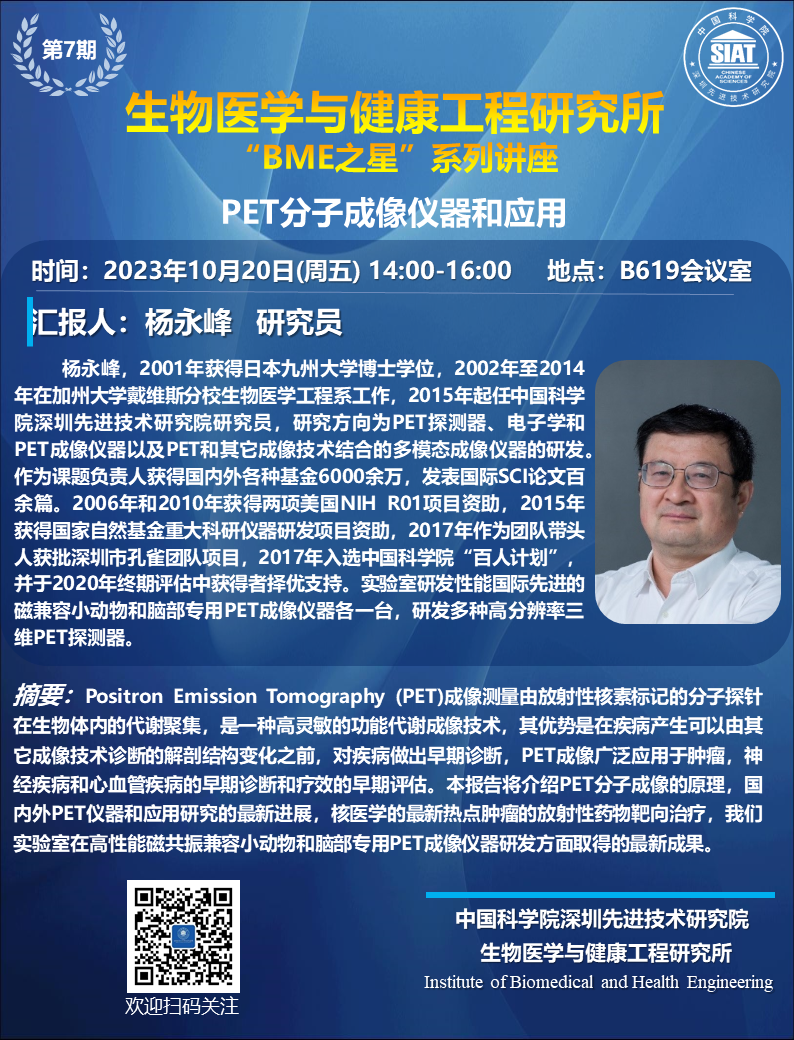 届时,杨永峰 研究员将为大家带来题为“PET分子成像仪器和应用”的报告。