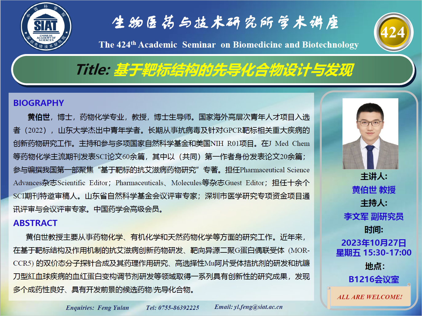 大家好! 医药所第424期学术讲座将于2023年10月27日 星期五 15:30-17:00 B1216会议室举行。本次讲座邀请了来自山东大学, 黄伯世 教授带来“基于靶标结构的先导化合物设计与发现”的报告。届时,李文军 副研究员将主持讲座。