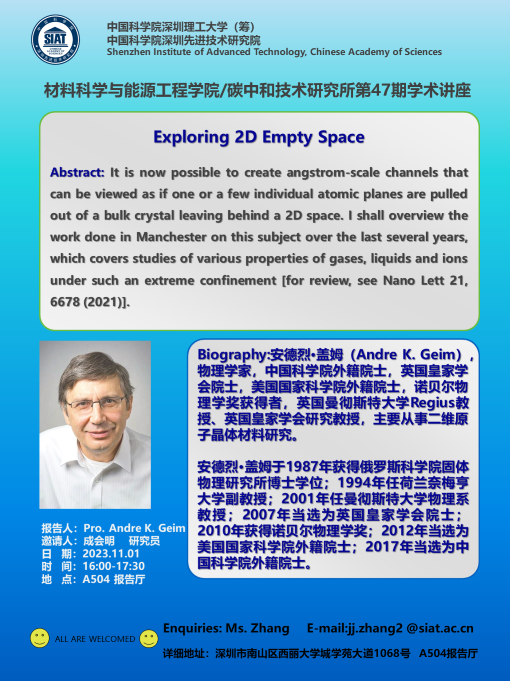 材料科学与能源工程学院/碳中和技术研究所第47期学术讲座将于11月1日(周三)16:00-17:30在A504报告厅召开。本次讲座特邀英国皇家学会研究教授、诺贝尔物理学奖得主安德烈 盖姆 (Andre K. Geim)作题为《 Exploring 2D Empty Space 》的学术报告。