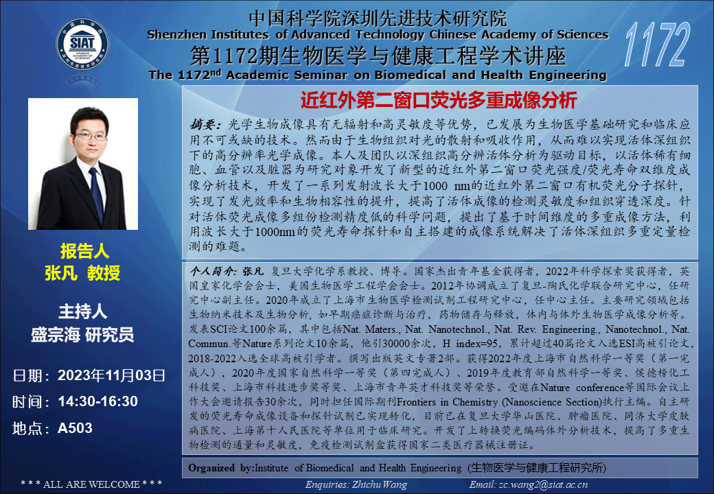 本次讲座邀请了 复旦大学 张凡 教授带来题为“近红外第二窗口荧光多重成像分析”的报告。