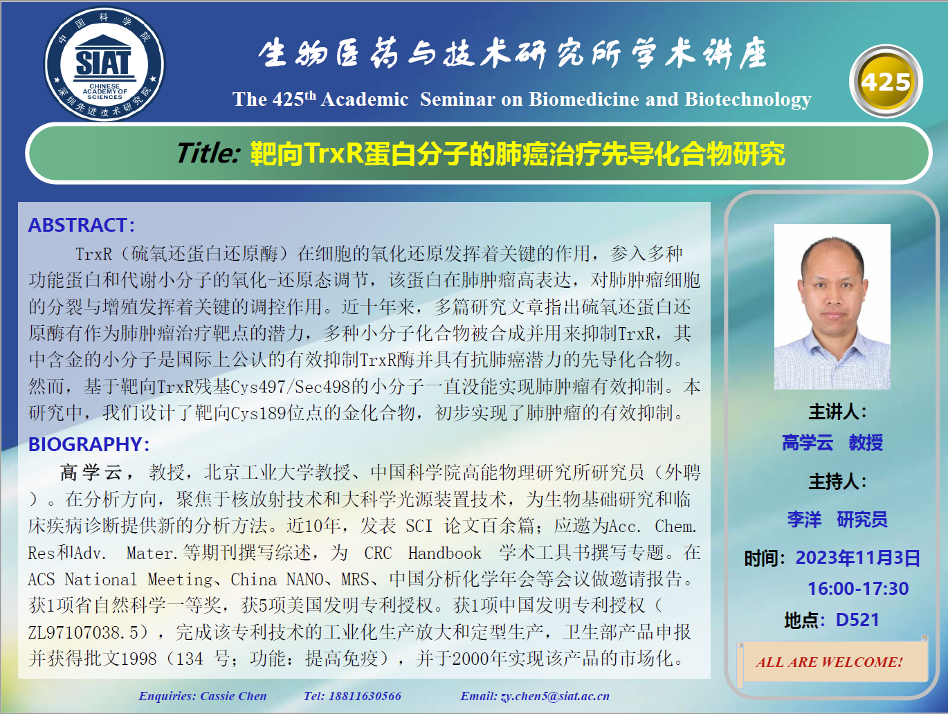 大家好! 医药所第425期学术讲座将于2023年11月03日 星期五 16:00-17:30 D521会议室举行。本次讲座邀请了来自北京工业大学,高学云 教授带来“靶向TrxR蛋白分子的肺癌治疗先导化合物研究”的报告。届时,李洋 研究员将主持讲座。
