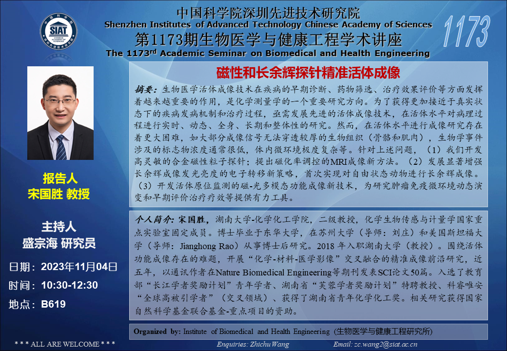 本次讲座邀请了 湖南大学 宋国胜 教授带来题为“磁性和长余辉探针精准活体成像”的报告。