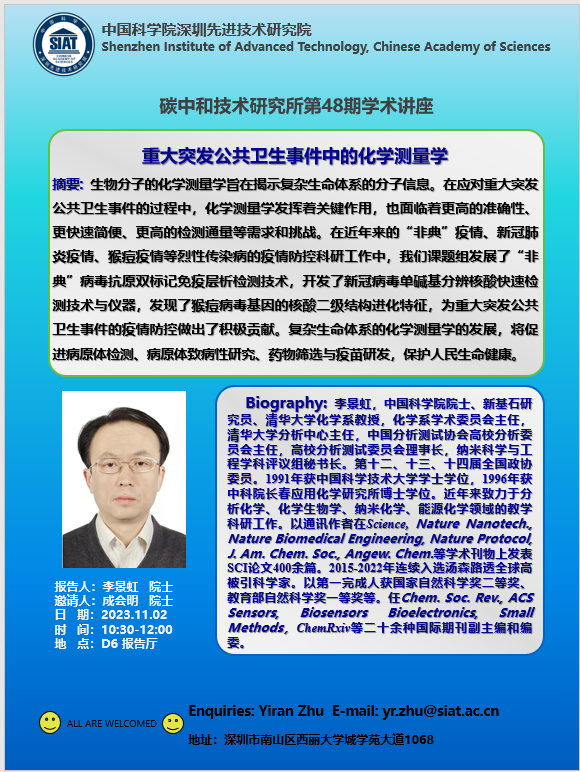 碳中和技术研究所第48期学术讲座将于11月2日(周四)10:30-12:00在D6报告厅召开。本次讲座特邀中国科学院李景虹 院士作题为《重大突发公共卫生事件中的化学测量学》的学术报告。