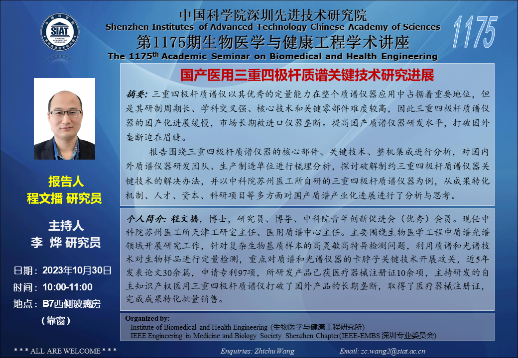 医工所第1175期学术讲座将于 2023年10月30日(周一) 10:00-11:00 在B7西侧玻璃房(靠窗)会议室举行。