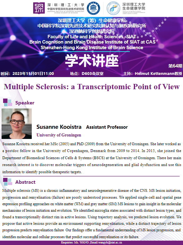由格罗宁根大学 ,Susanne Kooistra 助理教授,带来题为“Multiple Sclerosis: a Transcriptomic Point of View”专题讲座。