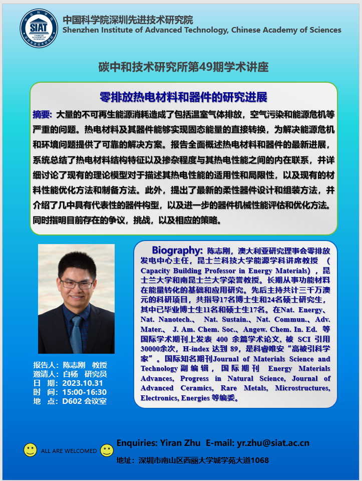碳中和技术研究所第49期学术讲座将于10月31日(周二)15:00-16:30在D602会议室召开。本次讲座特邀昆士兰科技大学 陈志刚 教授作题为《零排放热电材料和器件的研究进展》的学术报告。