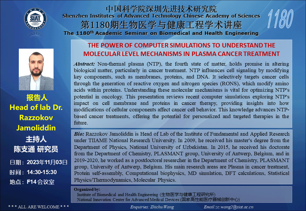 本次讲座邀请了 TIIAME National Research University Dr. Razzokov Jamoliddin带来题为“THE POWER OF COMPUTER SIMULATIONS TO UNDERSTAND THE MOLECULAR LEVEL MECHANISMS IN PLASMA CANCER TREATMENT”的报告。