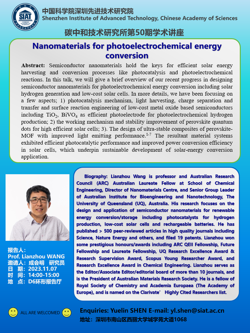 碳中和技术研究所第50期学术讲座将于11月7日(周二)14:00-15:00在D6环形报告厅召开。本次讲座特邀昆士兰大学 Prof. Lianzhou WANG作题为《Nanomaterials for photoelectrochemical energy conversion》的学术报告。