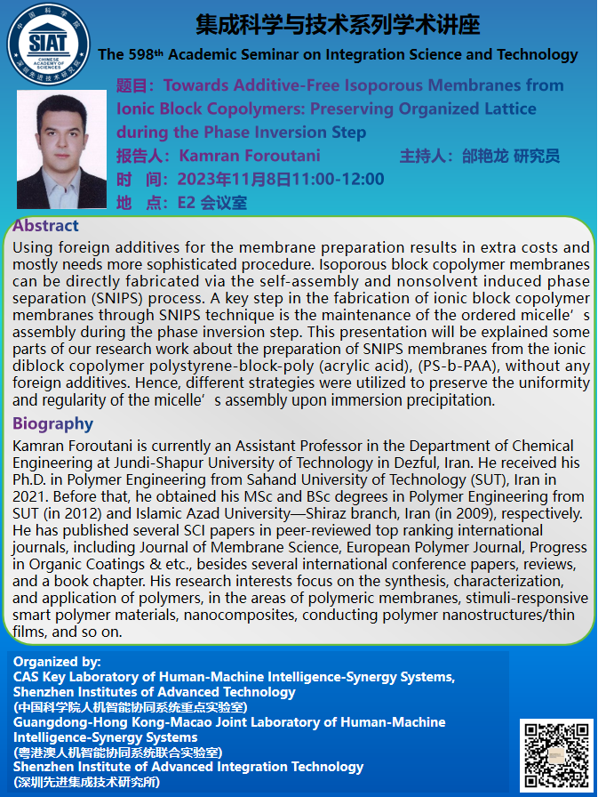集成所第598期集成科学与技术系列学术讲座将于2023年11月8日(周三)下午11:00-12:00于E2会议室召开,本次讲座特邀Jundi-Shapur University of Technology的Kamran Foroutani 助理教授作题为《Towards Additive-Free Isoporous Membranes from Ionic Block Copolymers: Preserving Organized Lattice during the Phase Inversion Step》的学术报告。