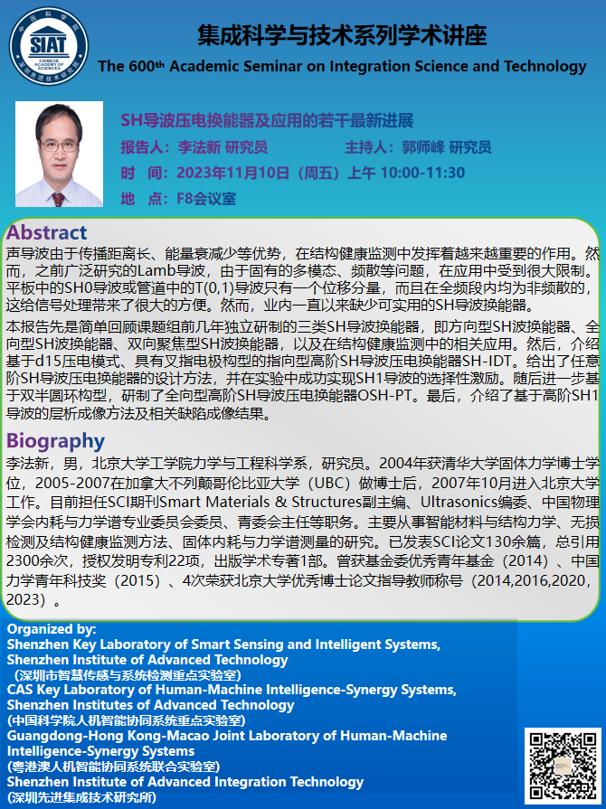 集成所第600期集成科学与技术系列学术讲座将于2023年11月10日(周五)上午10:00-11:30于F8会议室召开,本次讲座特邀北京大学的李法新 研究员作题为《SH导波压电换能器及应用的若干最新进展》的学术报告。