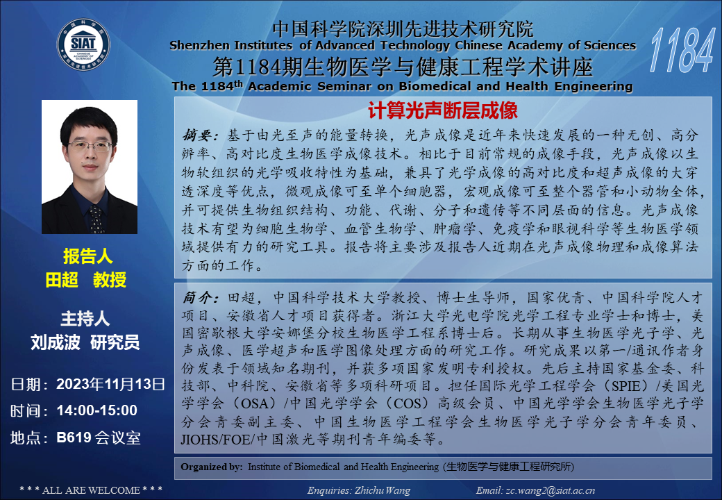 本次讲座邀请了 中国科学技术大学 田超 教授带来题为“计算光声断层成像”的报告。
