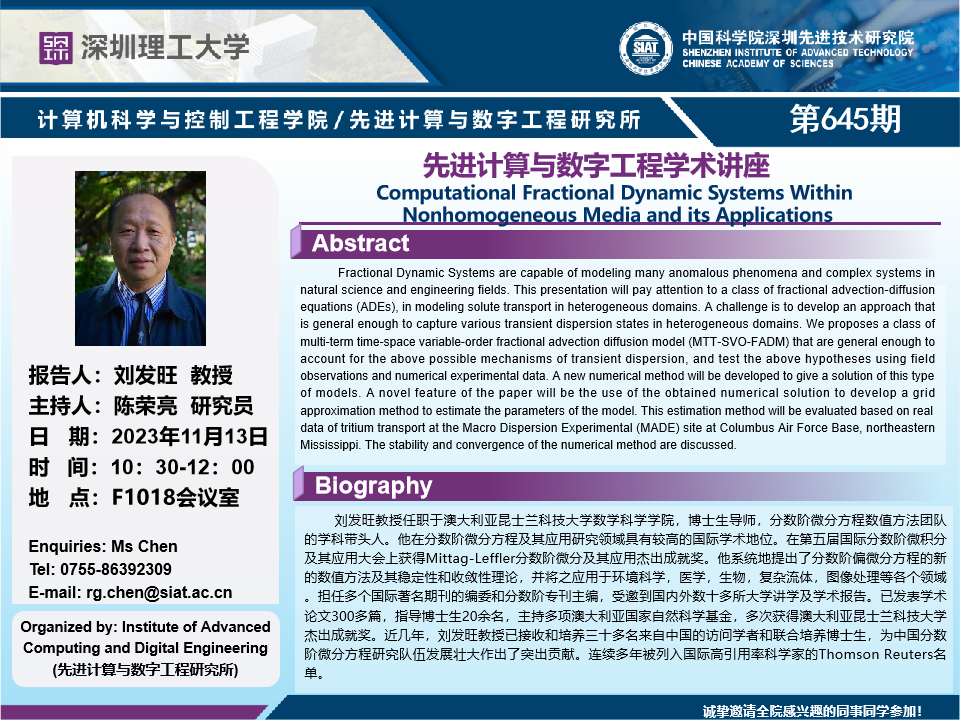 大家好!计算机学院/先进计算与数字工程研究所学术讲座第645期将于11月13日10:30-12:00在F1018会议室举行,本次讲座将邀请澳大利亚昆士兰科技大学 刘发旺 教授作题为“Computational Fractional Dynamic Systems Within Nonhomogeneous Media and its Applications”的报告。本次报告将由数字所 陈荣亮 研究员主持,诚挚邀请大家参加、学习和交流!