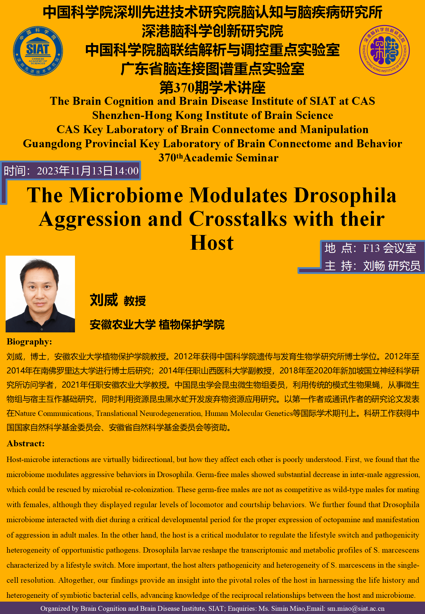 由安徽农业大学植物保护学院,刘威教授,带来“The Microbiome Modulates Drosophila Aggression and Crosstalks with their Host” 的专题报告。