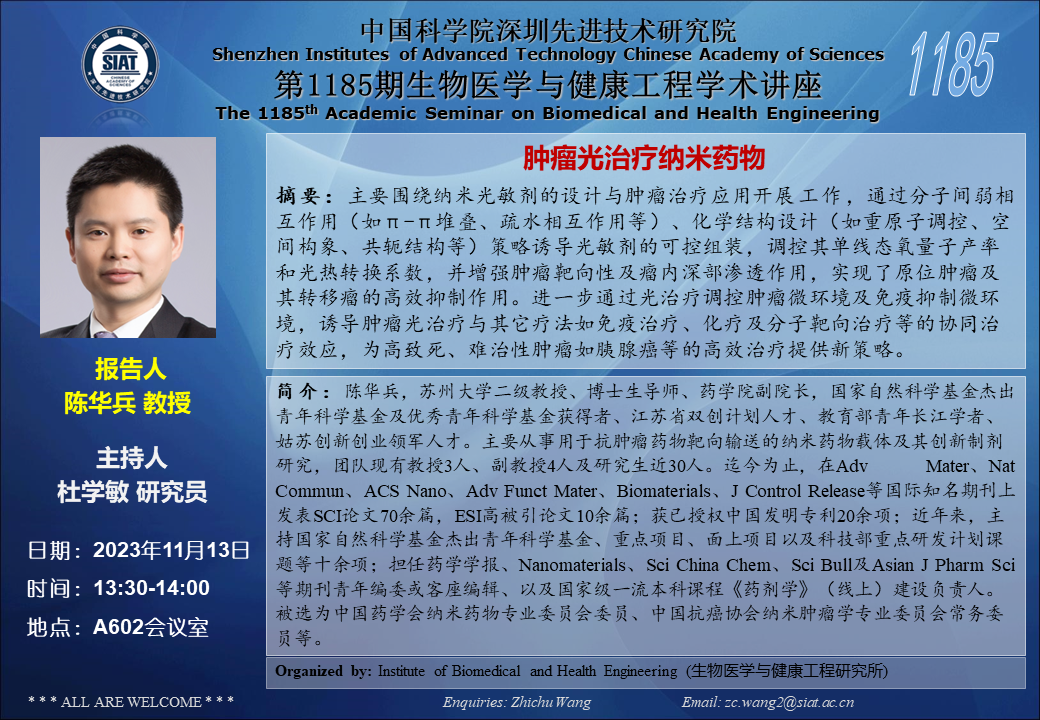 本次讲座邀请了 苏州大学 陈华兵 教授带来题为“肿瘤光治疗纳米药物”的报告。
