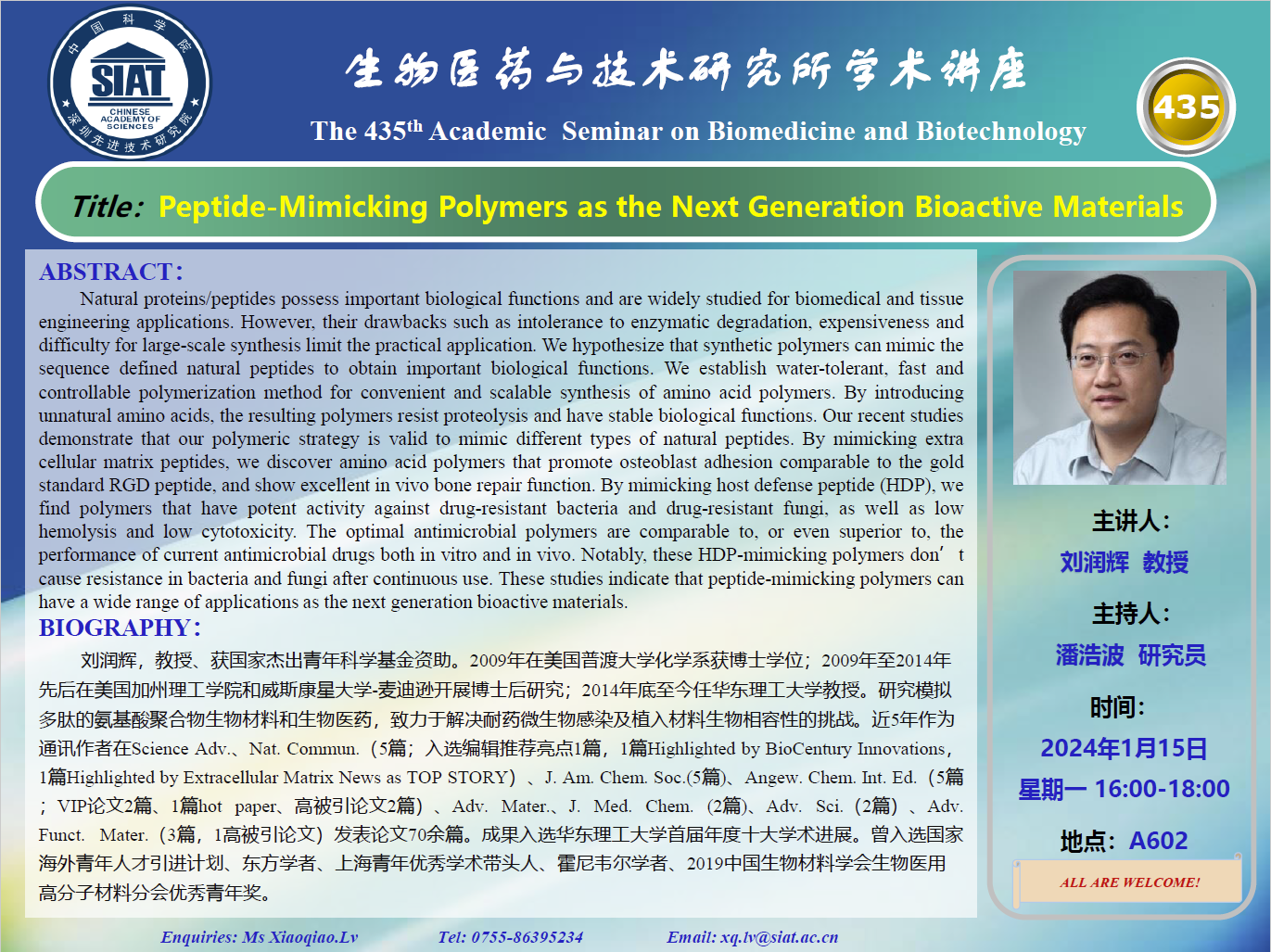 大家好! 医药所第435期学术讲座将于2024年1月15日 星期一 16:00-18:00 A602会议室举行。本次讲座邀请了来自华东理工大学 刘润辉 教授带来“Peptide-Mimicking Polymers as the Next Generation Bioactive Materials”的报告。届时,潘浩波 研究员将主持讲座。