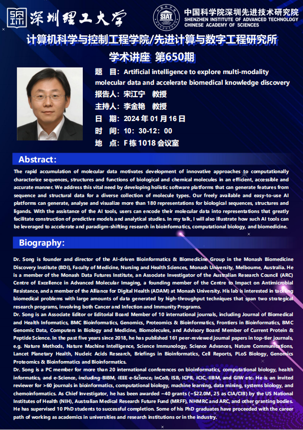 大家好!计算机学院/先进计算与数字工程研究所学术讲座第650期将于1月16日10:30-12:00在F栋1018会议室举行,本次讲座将邀请莫纳什大学(Monash University) 宋江宁 教授作题为“Artificial intelligence to explore multi-modality molecular data and accelerate biomedical knowledge discovery”的报告。本次报告将由计算机学院 李金艳 教授主持,诚挚邀请大家参加、学习和交流!