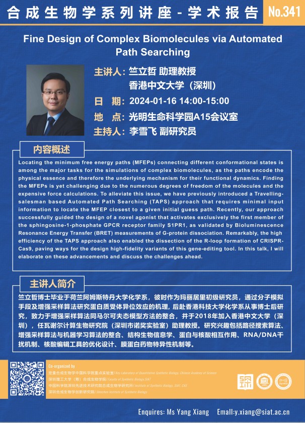 合成所/合成生物学院 第341期 学术讲座将于 1月16日(星期二)14:00-15:00 在 光明生命科学园A15会议室 举行。