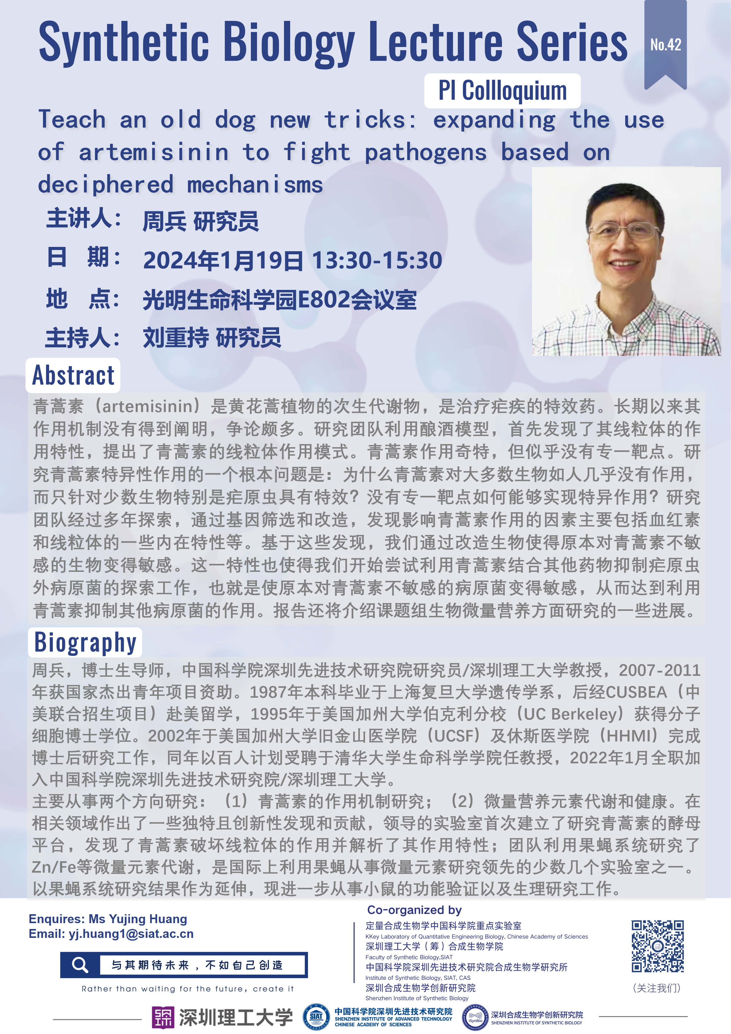 本次讲座邀请了 合成基因组学研究中心 周兵 研究员 带来题为“Teach an old dog new tricks: expanding the use of artemisinin to fight pathogens based on deciphered mechanisms”的报告。