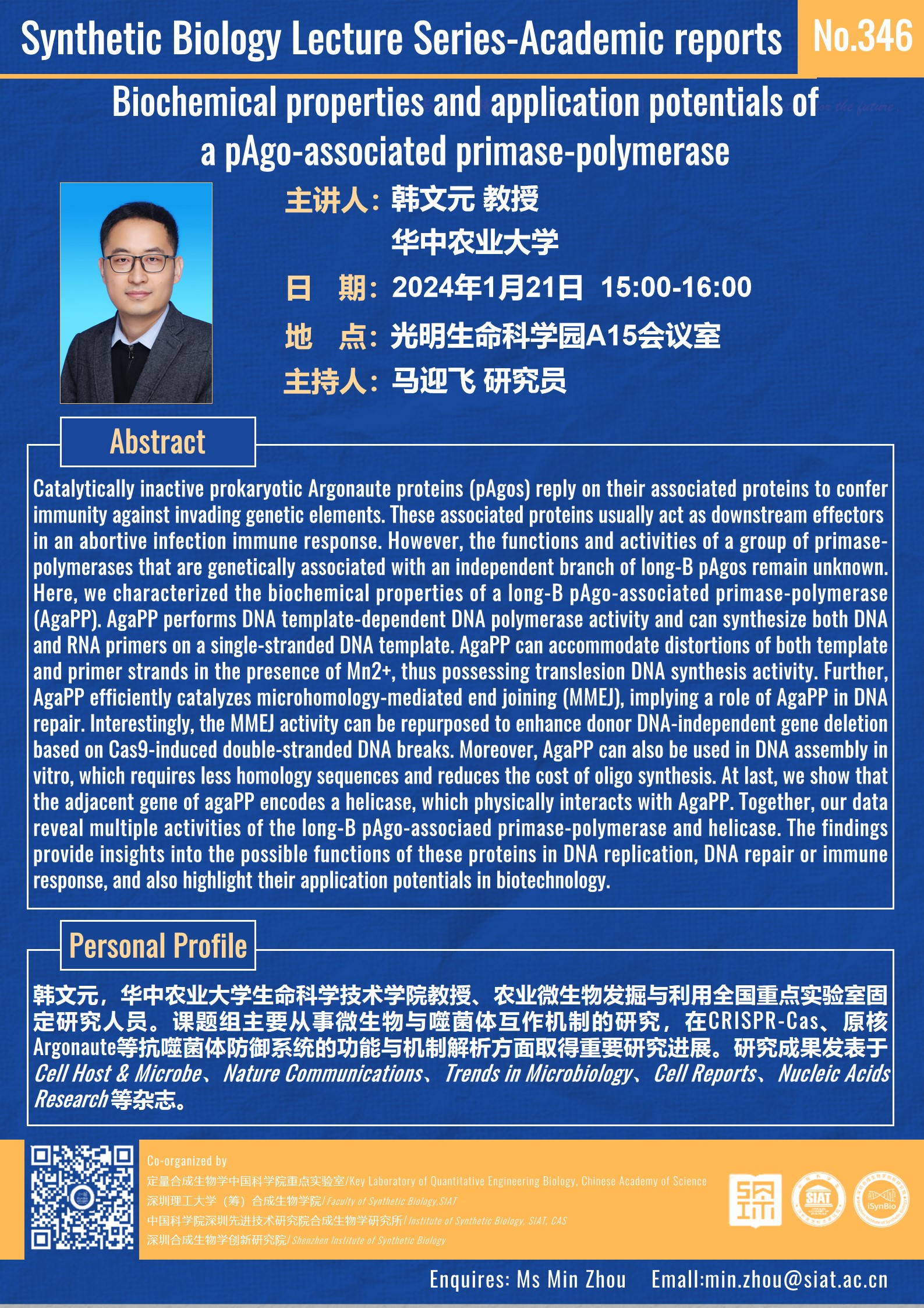 本次讲座邀请了 华中农业大学 韩文元 教授 带来题为“Biochemical properties and application potentials of a pAgo-associated primase-polymerase”的报告。