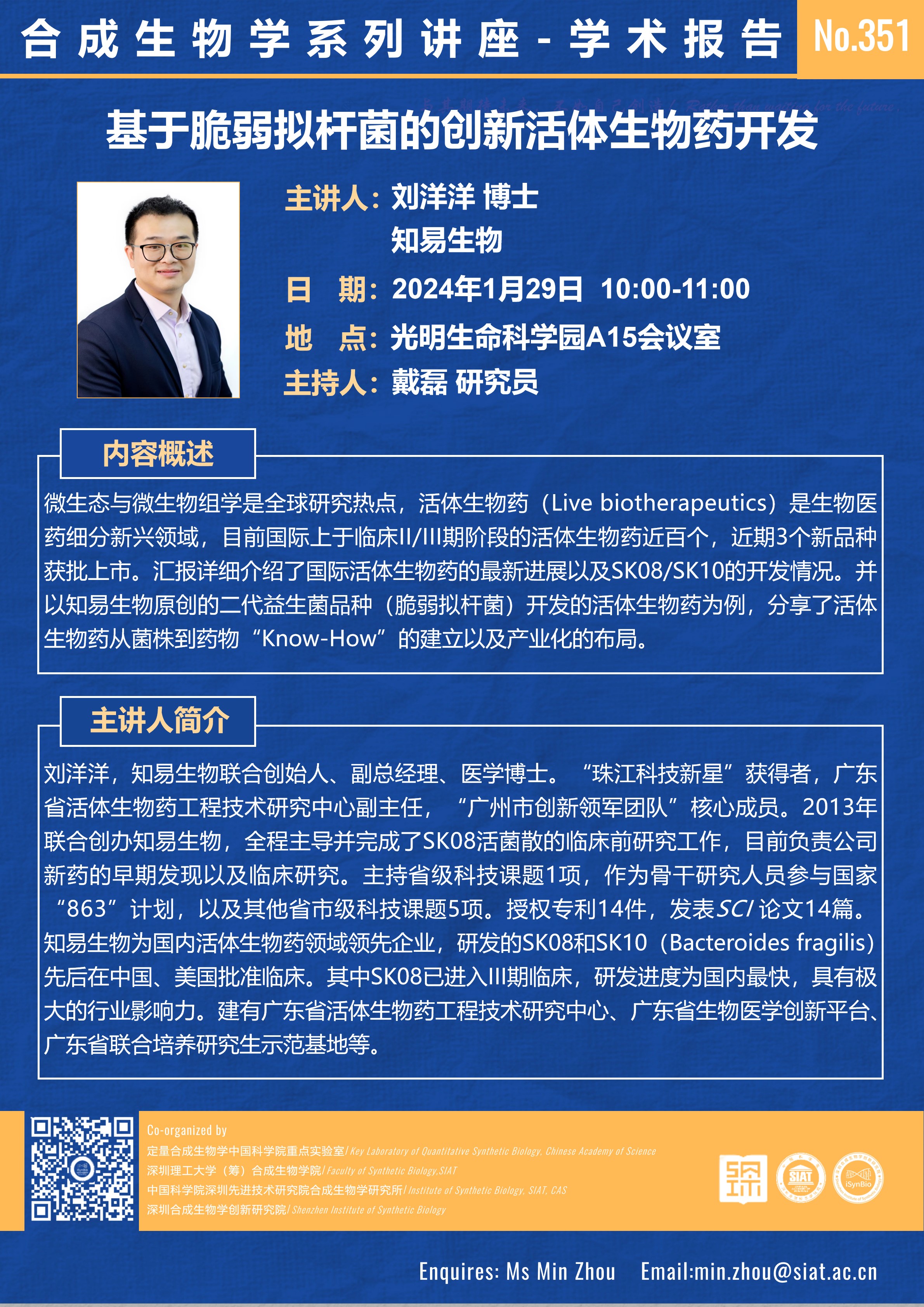 合成所/合成生物学院第351期学术讲座将于 1月29日(星期一)10:00-11:00 在 光明生命科学园A15会议室 举行。