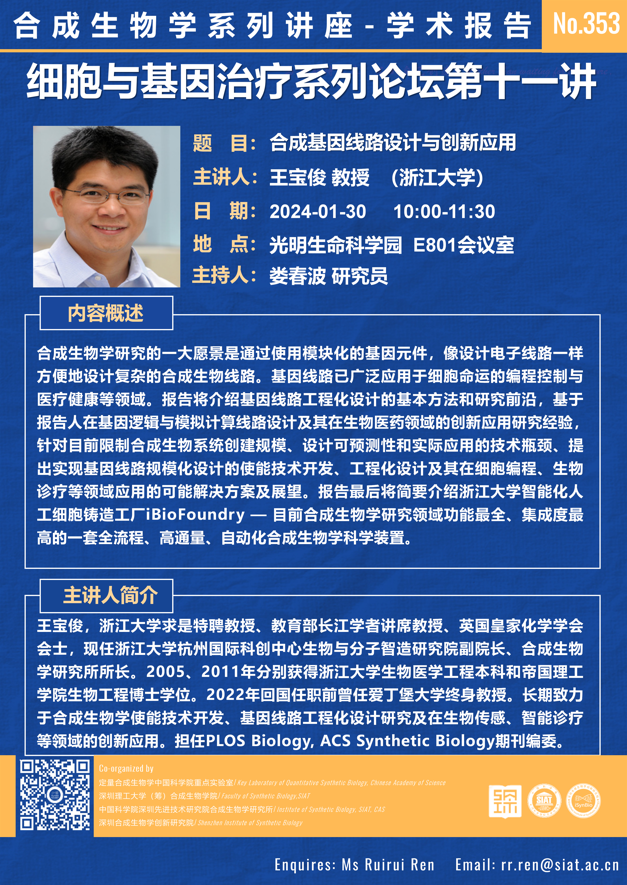 【2024年1月30日 合成所/合成生物学院】合成基因线路设计与创新应用