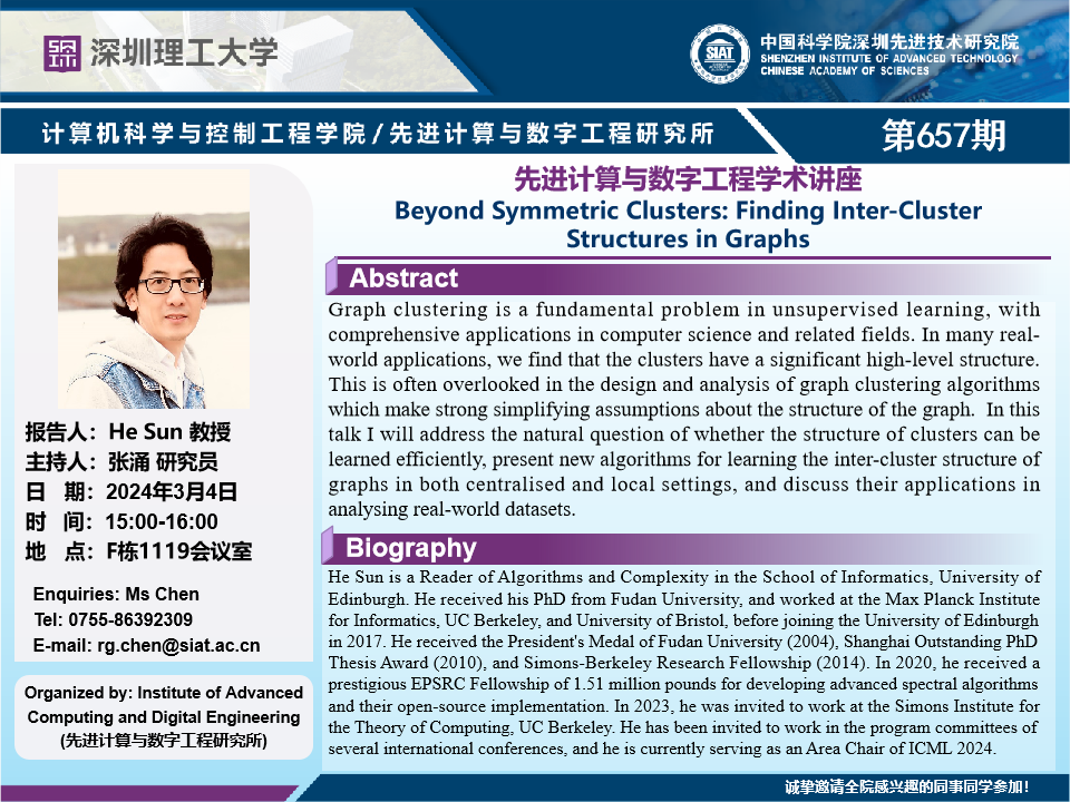 大家好!计算机学院/先进计算与数字工程研究所学术讲座第657期将于3月4日15:00-16:00在F1119会议室举行,本次讲座将邀请University of Edinburgh, He Sun 博士作题为“Beyond Symmetric Clusters: Finding Inter-Cluster Structures in Graphs”的报告。本次报告将由数字所 张涌 研究员主持,诚挚邀请大家参加、学习和交流!