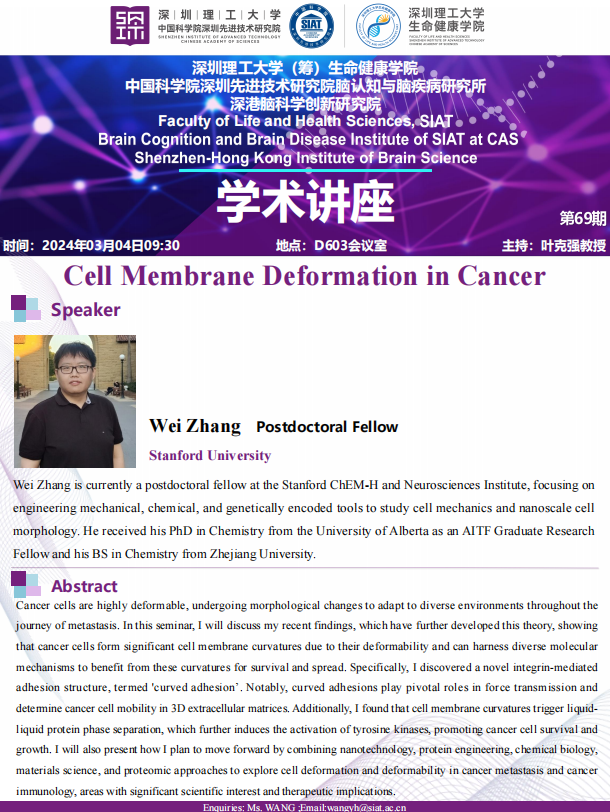 由斯坦福大学,张伟 博士,带来题为“Cell Membrane Deformation in Cancer”专题讲座。
