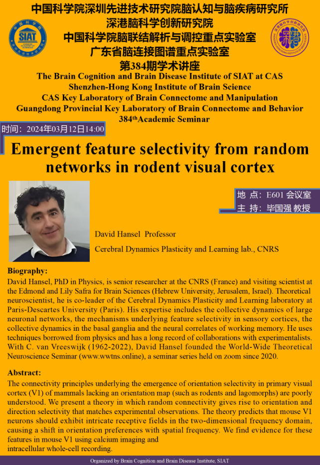 由David Hansel教授,带来“Emergent feature selectivity from random networks in rodent visual cortex” 的专题报告。