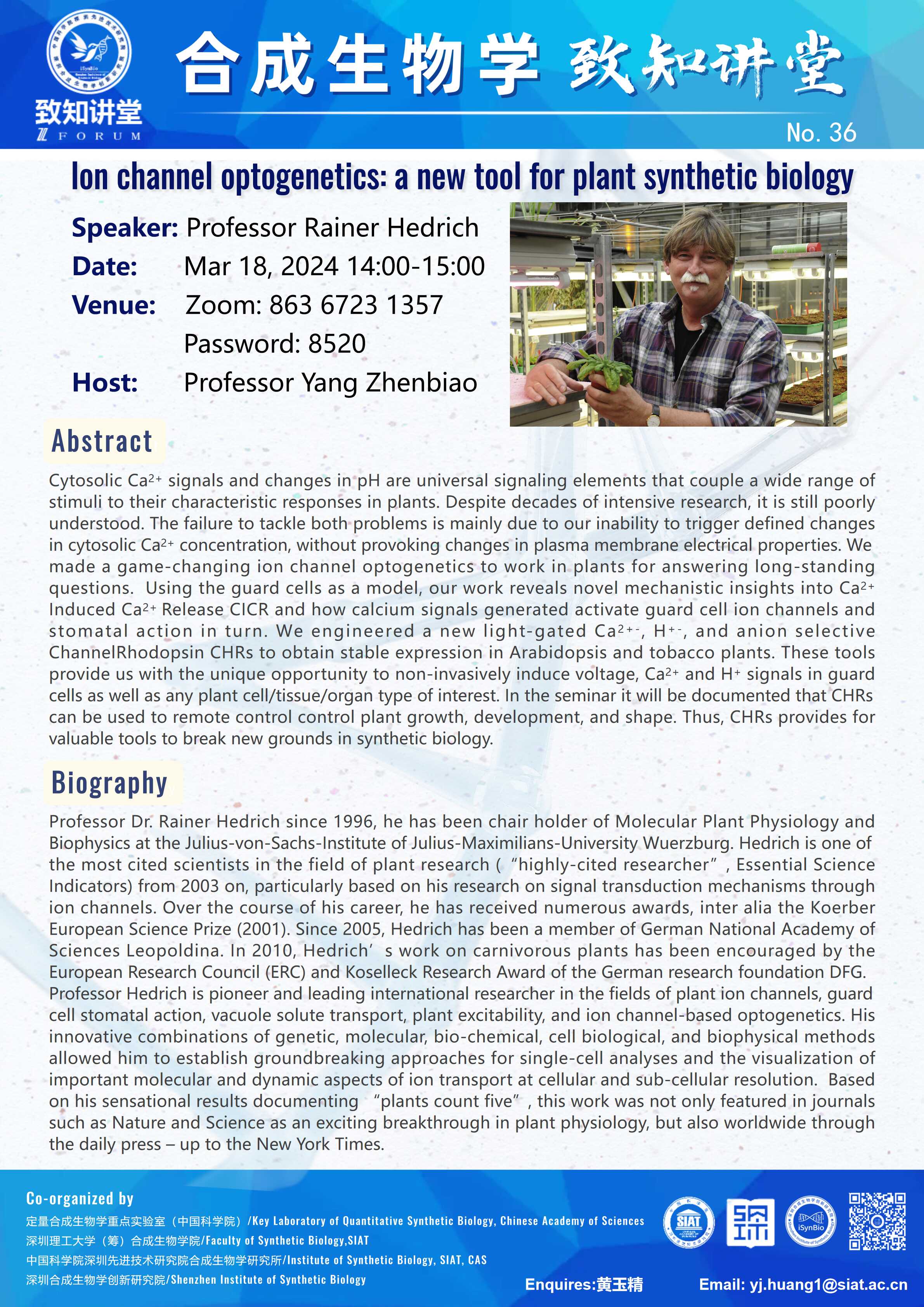 本次讲座邀请了 Prof.Rainer Hedrich 带来题为“Ion channel optogenetics: A new tool for plant synthetic biology (离子通道光遗传学:植物合成生物学的新工具)” 报告。