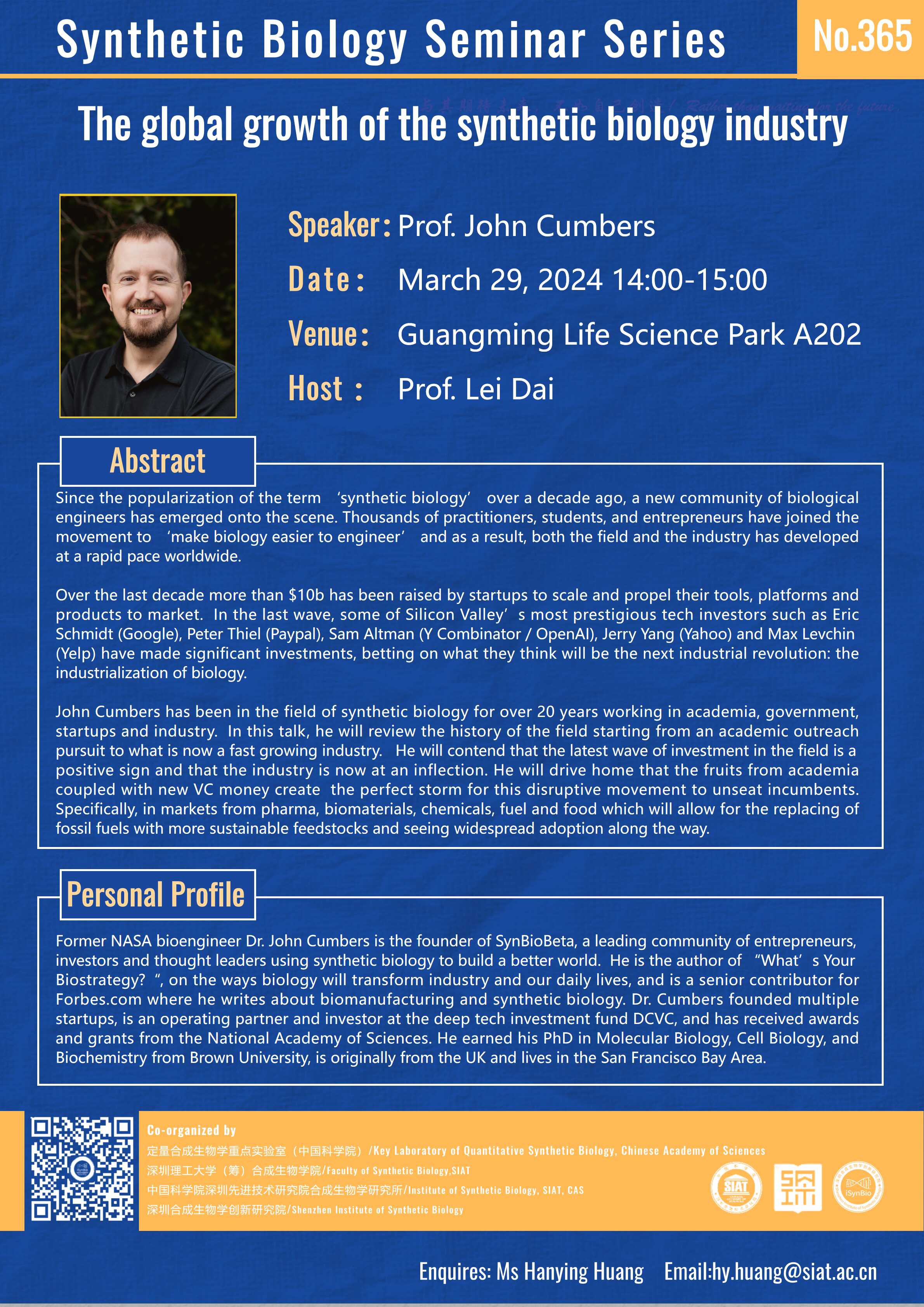 本次讲座邀请了 Prof. John Cumbers 带来题为“The global growth of the synthetic biology industry”的报告。