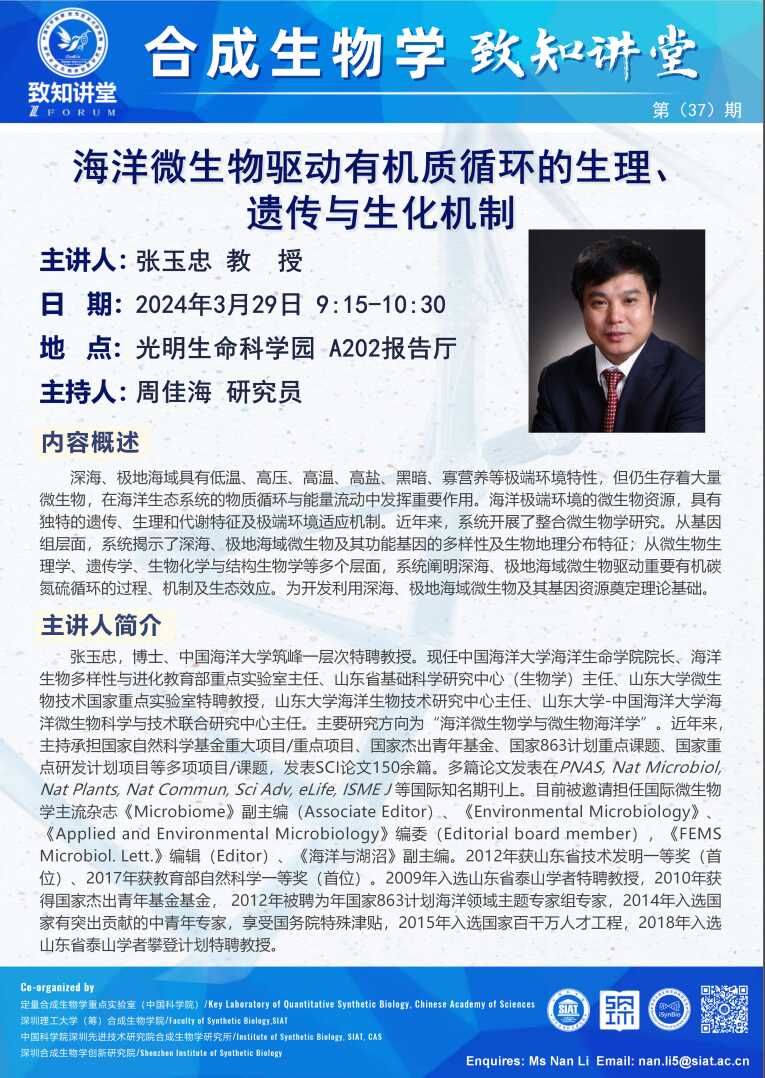 【2024年3月29日 深圳合成生物学创新研究院/合成生物学研究所/合成生物学院】海洋微生物驱动有机质循环的生理、遗传与生化机制