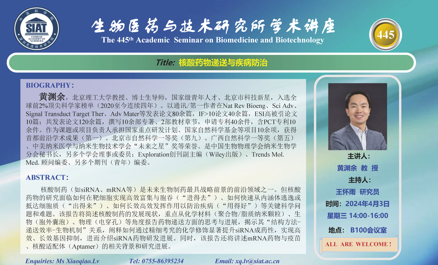 大家好! 医药所第445期学术讲座将于2024年4月3日 星期三 14:00-16:00 B100会议室举行。本次讲座邀请了来自北京理工大学 黄渊余 教授 带来“核酸药物递送与疾病防治”的报告。届时,王怀雨 研究员将主持讲座。
