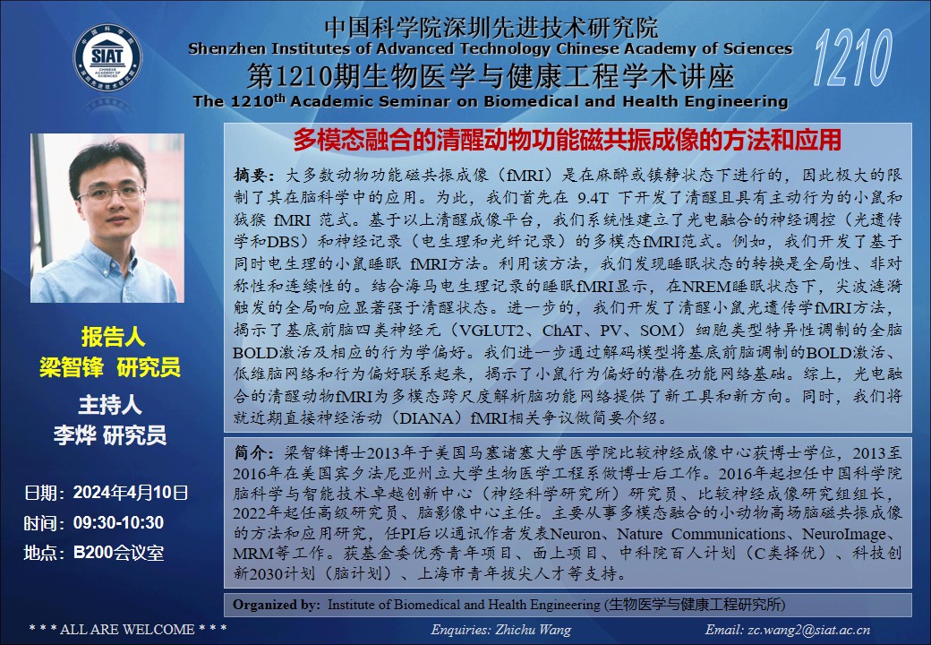 本次讲座邀请了 中国科学院脑科学与智能技术卓越创新中心 梁智锋 研究员带来题为“多模态融合的清醒动物功能磁共振成像的方法和应用”的报告。