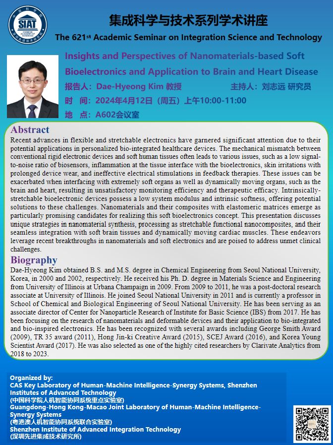 集成所第621期集成科学与技术系列学术讲座将于4月12日(周五)上午10:00-11:00在A602会议室召开,本次讲座特邀Seoul National University的Prof. Dae-Hyeong Kim作题为《Insights and Perspectives of Nanomaterials-based Soft Bioelectronics and Application to Brain and Heart Disease》的学术报告。