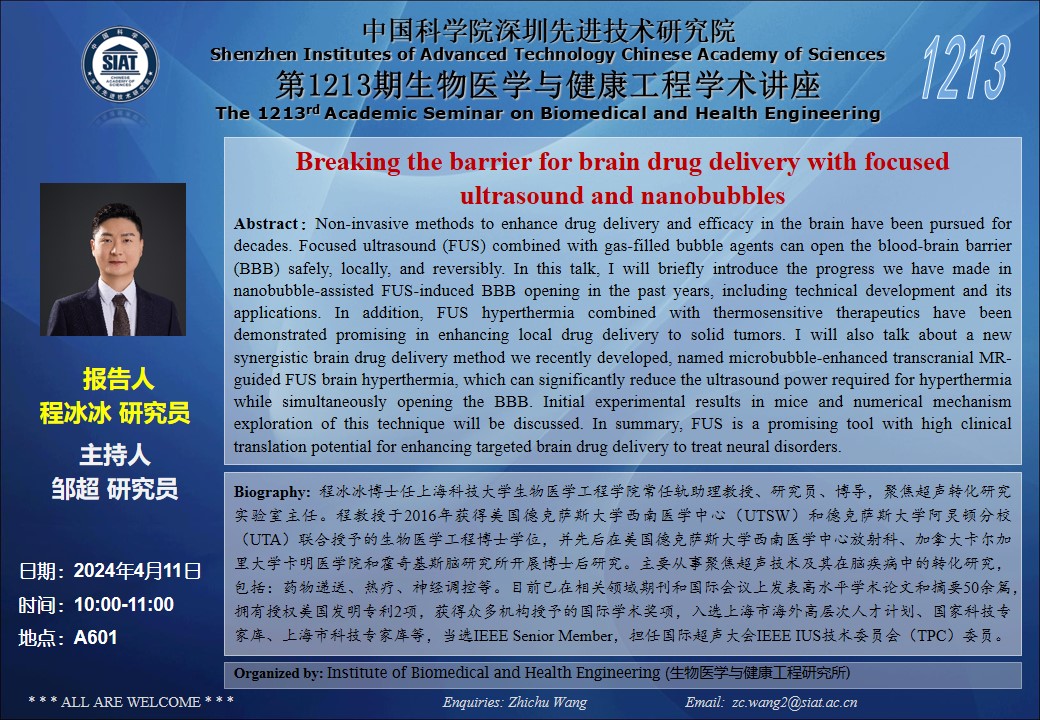 本次讲座邀请了 上海科技大学 程冰冰 研究员带来题为“Breaking the barrier for brain drug delivery with focused ultrasound and nanobubbles”的报告。