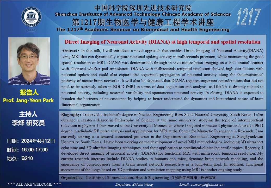 本次讲座邀请了 韩国成均馆大学 Prof. Jang-Yeon Park带来题为“Direct Imaging of Neuronal Activity (DIANA) at high temporal and spatial resolution”的报告。