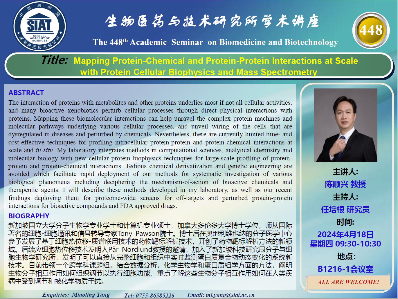 医药所第448期学术讲座将于2024年4月18日 星期四 9:30-10:30 B1216-1会议室举行。本次讲座邀请了来自新加坡科技研究局分子与细胞生物学研究所 陈顺兴 教授带来“Mapping Protein-Chemical and Protein-Protein Interactions at Scale with Protein Cellular Biophysics and Mass Spectrometry”的报告。届时,任培根 研究员将主持讲座。