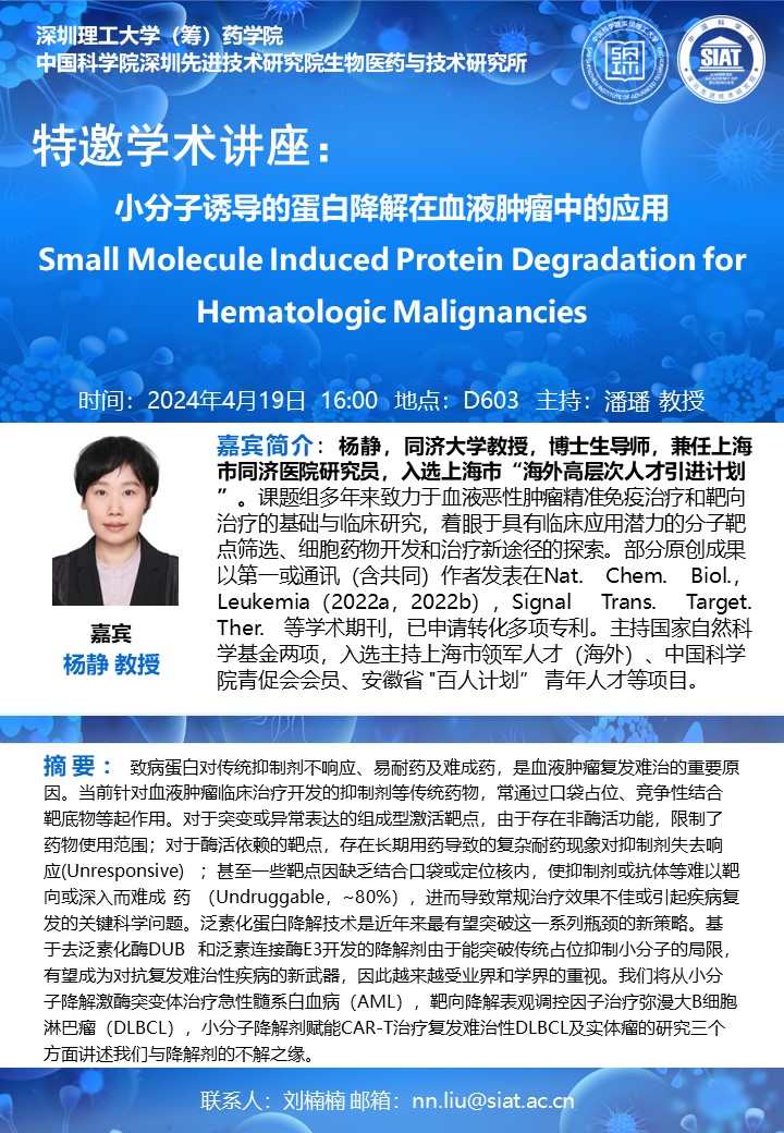 【2024年04月19日 药学院/医药所】小分子诱导的蛋白降解在血液肿瘤中的应用