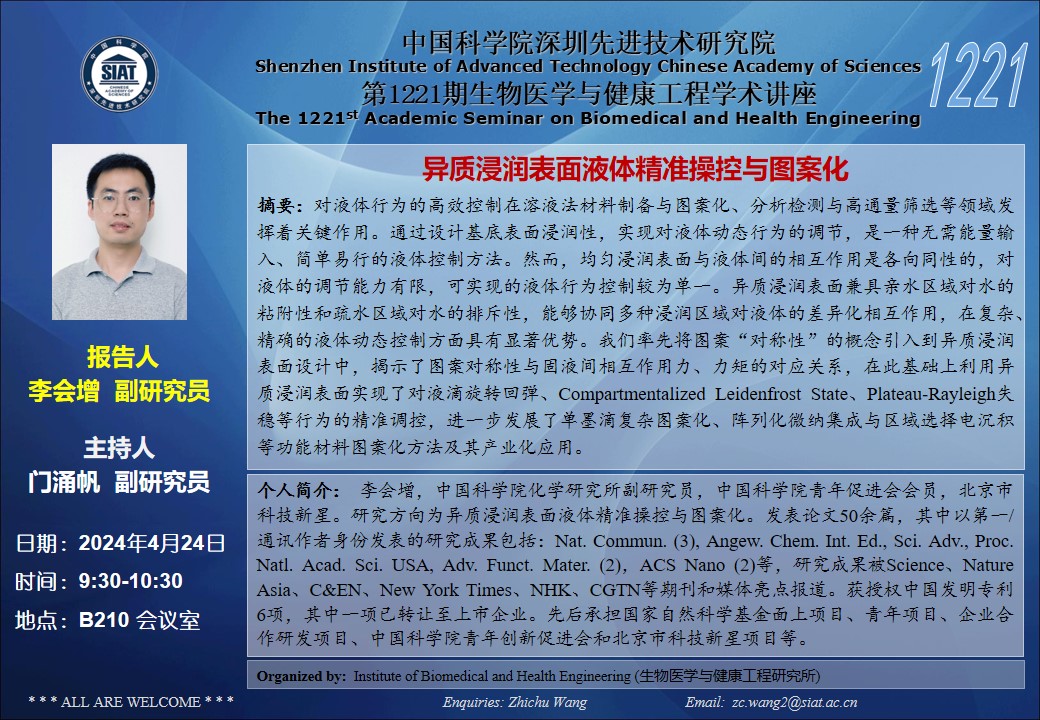 本次讲座邀请了 中国科学院化学研究所 李会增 副研究员带来题为“异质浸润表面液体精准操控与图案化”的报告。