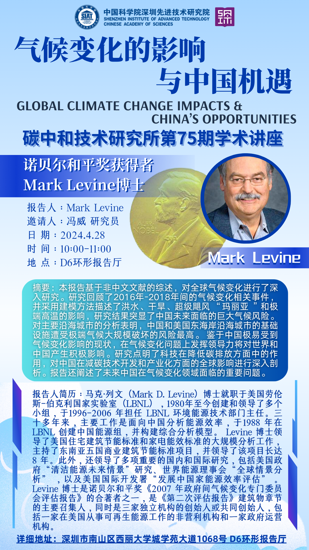 碳中和技术研究所第76期学术讲座将于4月28日(周日)10:00-11:00在D6环形报告厅召开。本次讲座特邀美国劳伦斯-伯克利国家实验室(LBNL)的诺贝尔和平奖获得者马克-列文(Mark D. Levine) 博士作题为《气候变化的影响与中国机遇》的学术报告。
