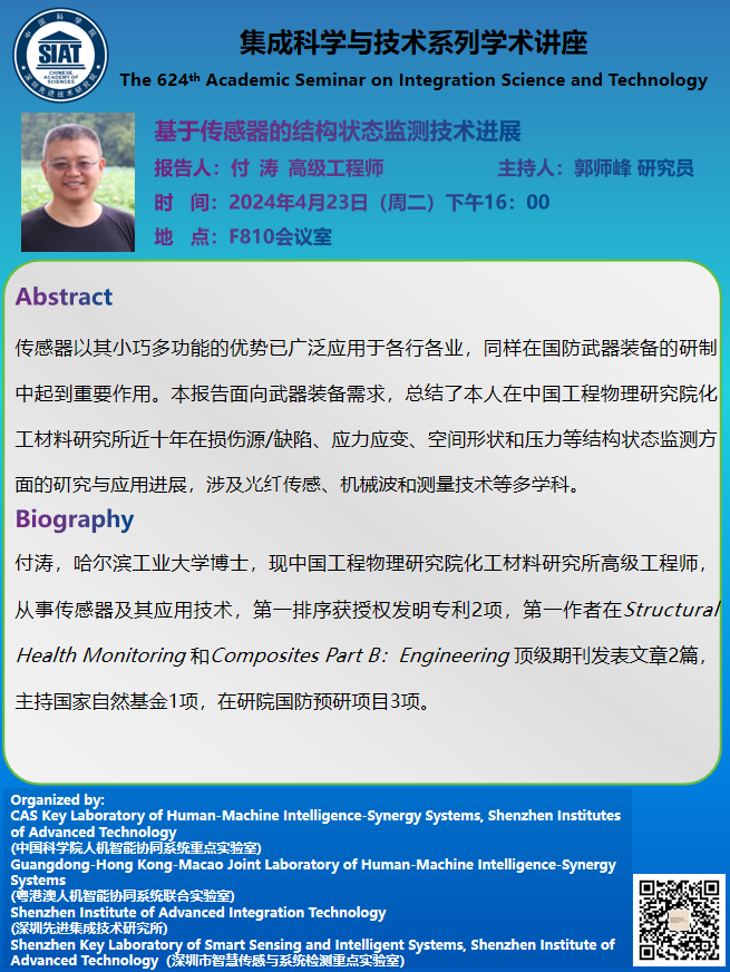 集成所第624期集成科学与技术系列学术讲座将于4月23日(周二)下午16:00在F810会议室召开,本次讲座特邀中国工程物理研究院的付涛 高级工程师作题为《基于传感器的结构状态监测技术进展》的学术报告。