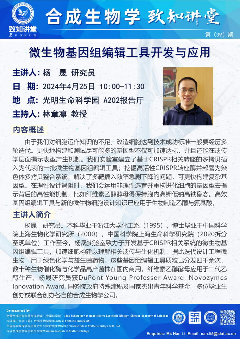 深圳合成生物学创新研究院/合成生物学研究所/合成生物学院“致知讲堂”第三十九期 将于 2024年4月25日(星期四)10:00-11:30 在 光明生命科学园 A202报告厅 进行。