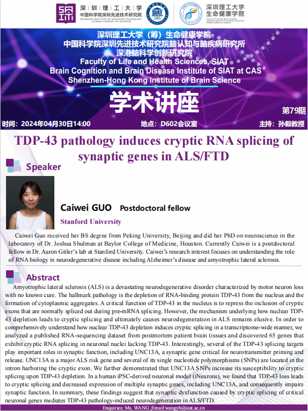 大家好! 生命健康学院将于04月30日 14:00,地点:D602会议室 举办第79期学术讲座。 由斯坦福大学,郭采薇博士,带来题为“TDP-43 pathology induces cryptic RNA splicing of synaptic genes in ALS/FTD”专题讲座。 诚挚邀请大家学习交流!