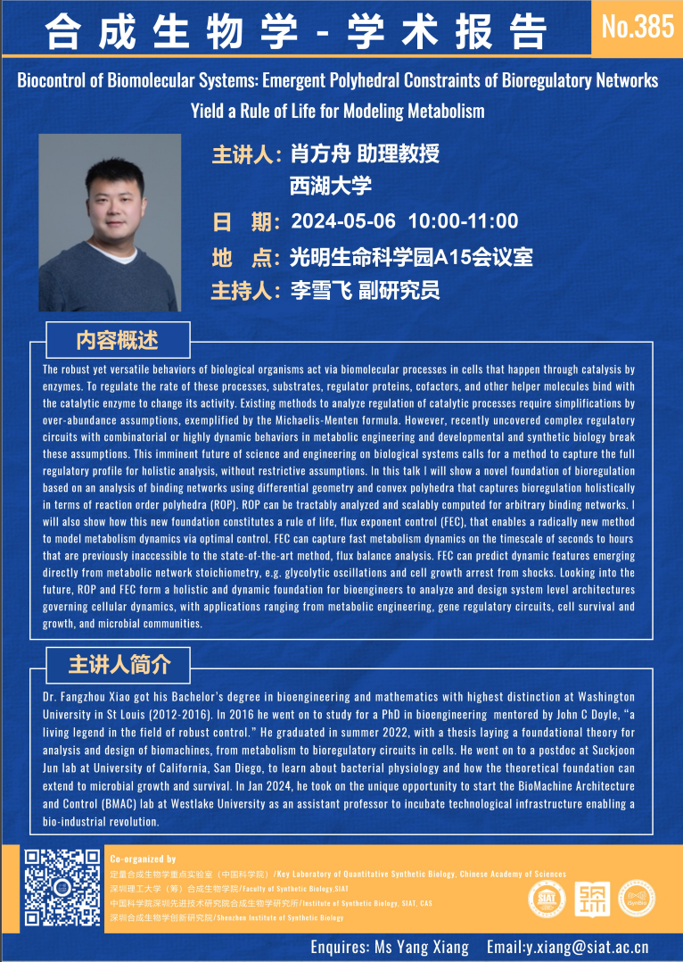 本次讲座邀请了 肖方舟 助理教授 带来题为“Biocontrol of Biomolecular Systems: Emergent Polyhedral Constraints of Bioregulatory Networks Yield a Rule of Life for Modeling Metabolism”的报告。