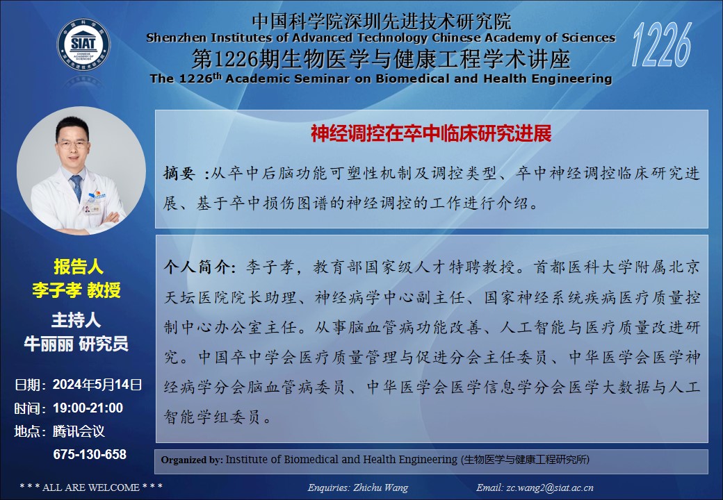 医工所第1226期学术讲座将于 2024年5月14日(周二) 19:00-21:00 在腾讯会议:675-130-658举行。