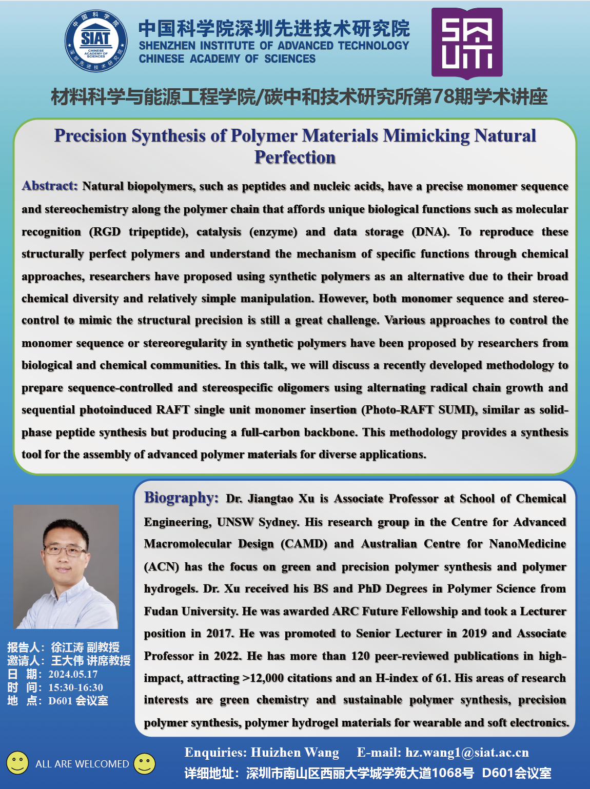 材料科学与能源工程学院/碳中和技术研究所第78期学术讲座将于5月17日(周五)15:30-16:30在D601会议室召开。本次讲座特邀新南威尔士大学徐江涛副教授作题为《Precision Synthesis of Polymer Materials Mimicking Natural Perfection》的学术报告。
